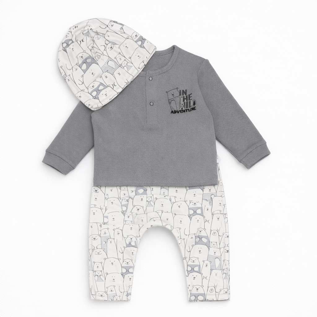 This cozy 3-piece organic cotton kids set by Mimi includes a soft grey long-sleeve top with a fun “In the Wild Adventure” print, matching printed pants with adorable bear illustrations, and a coordinating beanie hat. Designed with comfort and cuteness in mind, this outfit is made from 100% GOTS certified organic cotton, perfect for sensitive skin. Mimi is the first brand in Albania to offer GOTS certified kidswear made from sustainable materials.