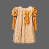 Bëjeni vogëlushen tuaj të shkëlqejë me këtë fustan të mrekullueshëm kadife në ngjyrë ari, i zbukuruar me shkëlqim vezullues, i krijuar për ta bërë çdo rast të paharrueshëm. Me mangë të fryra kadifeje, një fjongo madhështore dhe një prerje të hijshme A-line, ky fustan është zgjedhja ideale për dasma, ditëlindje dhe evente festive. Shtresa e brendshme e butë ofron rehati të përkryer, ndërsa shkëlqimi i artë reflekton dritën për një efekt magjik.