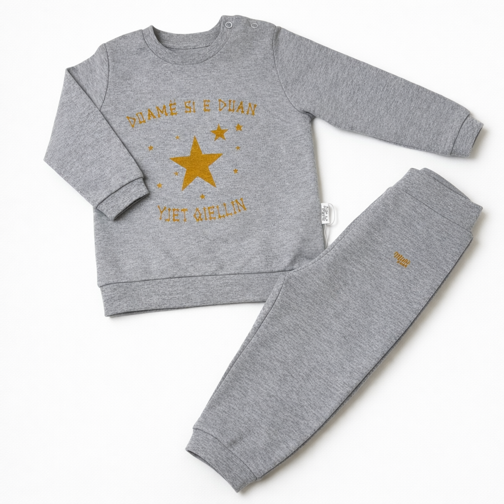 Shine bright with our Golden Star Two-Piece Set, crafted from 100% GOTS-certified organic cotton. This adorable set includes a soft long-sleeved sweatshirt with a golden star print and matching comfy pants. Perfect for stylish and playful days, the set is gentle on sensitive skin, breathable, and durable for everyday wear. Mimi proudly brought GOTS-certified organic cotton to the Albanian market, offering your child pure comfort and premium quality from the start.
