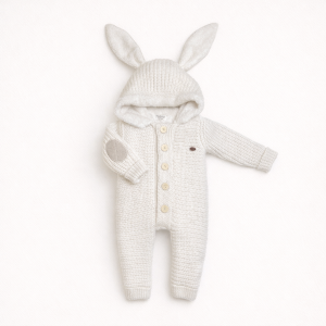 Mbajeni beben tuaj të ngrohtë dhe plot stil me kominoshet tona të qëndisura me veshë lepurushi, të bërë nga lesh me cilësi të lartë. Me një kapuç të butë dhe të ngrohtë, ky produkt hipoalergjik është perfekt për lëkurën e ndjeshme, duke garantuar ngrohtësi maksimale gjatë ditëve të ftohta. I përshtatshëm për foshnjat nga 0-3 muajsh deri në 9-12 muajsh, ky model i punuar me thurje ofron rehati maksimale. Një element i domosdoshëm për garderobën e foshnjës suaj këtë sezon!