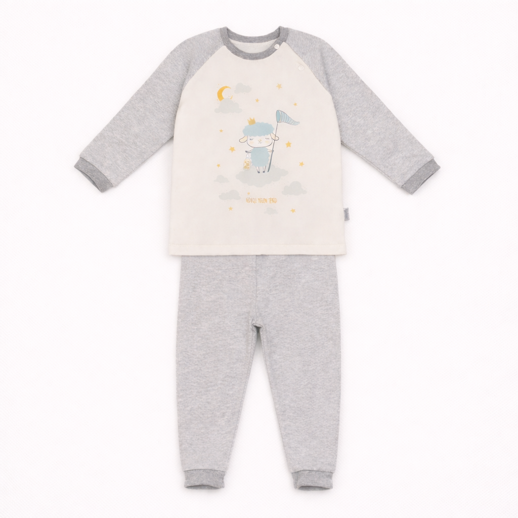 Wrap your little one in comfort with Mimi’s two-piece baby pajama set, made from GOTS-certified organic cotton — the highest global standard for organic textiles. Featuring a soft long-sleeve top with a dreamy lamb print and cozy grey footed pants, this set is perfect for peaceful nights. Mimi proudly introduced GOTS-certified organic cotton babywear to the Albanian market first, offering the safest and softest choice for your baby.