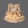 Fustani MIMI DYAN është krijuar për vajzat e vogla që duan të shkëlqejnë në çdo rast të veçantë. Me një trup të mbuluar plotësisht me shkëlqim dhe mëngë të fryra që bien në sy, si dhe një fund të gjerë prej tyli me shtresa, ky fustan është perfekt për të krijuar kujtime të paharrueshme. Pjesa e sipërme e ngushtë i jep një prekje elegance, ndërsa fundi me shtresa e bën të lehtë për t’u rrotulluar dhe për të luajtur. Ideal për festa fundviti, ditëlindje dhe evente festive, ky fustan i artë që shkëlqen është i domosdoshëm për vogëlushet që ndjekin modën.