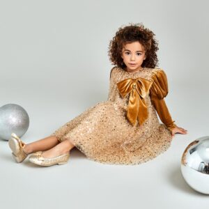 Lejojeni vogëlushen tuaj të shkëlqejë me këtë fustan magjik kadife me shkëlqim, i krijuar për elegancë dhe bukuri. Me supe të fryra, një dizajn të veçantë me fjongo dhe një fund të veshur me shkëlqim vezullues, ky fustan është zgjedhja ideale për festat e fundvitit, ditëlindjet, Krishtlindjet dhe evente formale. Materiali i butë, por me strukturë të bukur, ofron rehati dhe një pamje mbretërore. Kombinojeni me geta të kuqe dhe këpucë të përshtatshme për një paraqitje magjike.