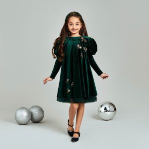 Fustani Mimi Esther është kombinimi perfekt mes magjisë së festave dhe elegancës së përjetshme. Me një bust të butë nga kadife jeshile, i zbukuruar me aplikacione të arta në formë yjesh, ky fustan rrezaton ngrohtësi dhe atmosferë festive. Fundi me motive tradicionale skoceze në të kuqe dhe jeshile, i plotësuar me shtresa tyli, sjell një prekje klasike, duke e bërë ideal për festat e Krishtlindjeve, mbledhjet familjare, sesionet fotografike dhe eventet e dimrit. Mëngët e fryra dhe manshetat e valëzuara krijojnë një siluetë tërheqëse dhe të sofistikuar, duke siguruar që vogëlushja juaj të shkëlqejë gjatë gjithë sezonit.