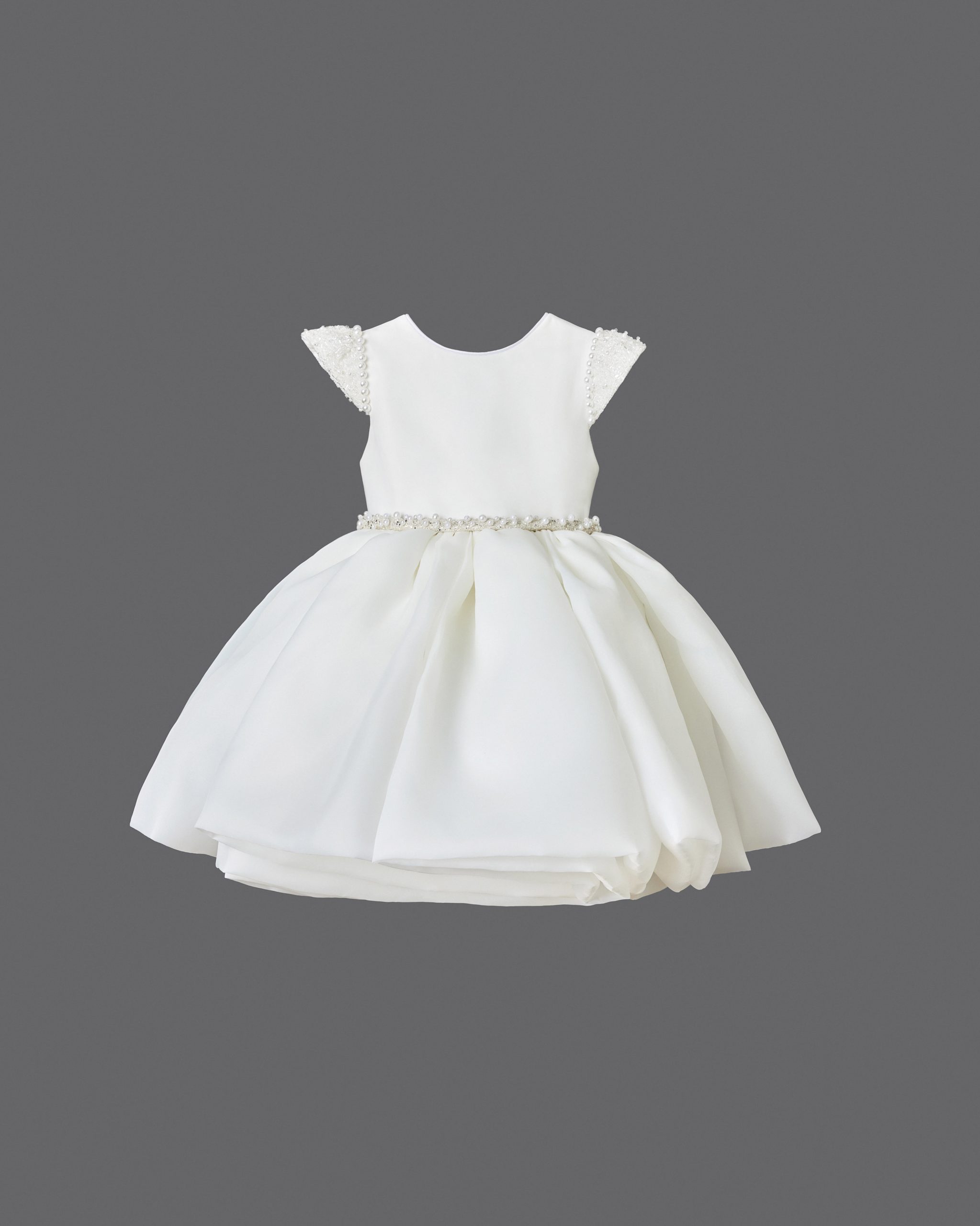 Mimi Galexia White Satin Dress for Girls – Elegant Cap Sleeve Dress with Beaded Waist