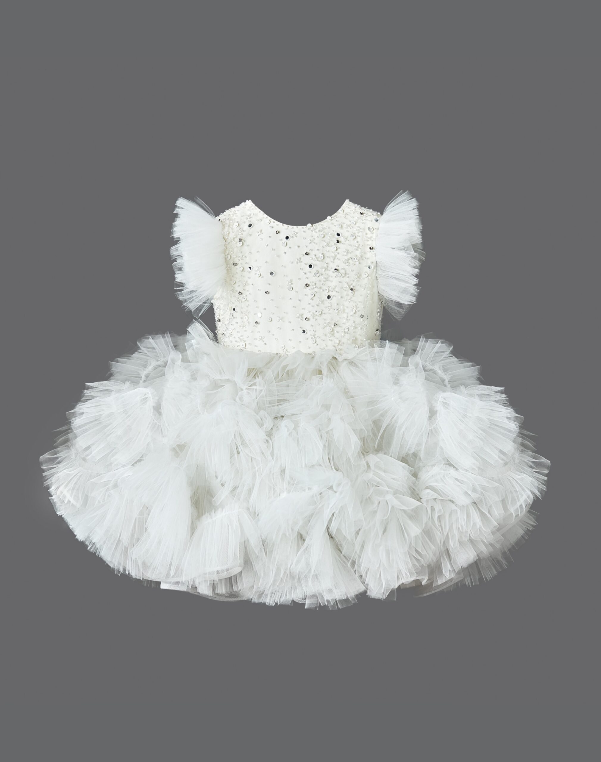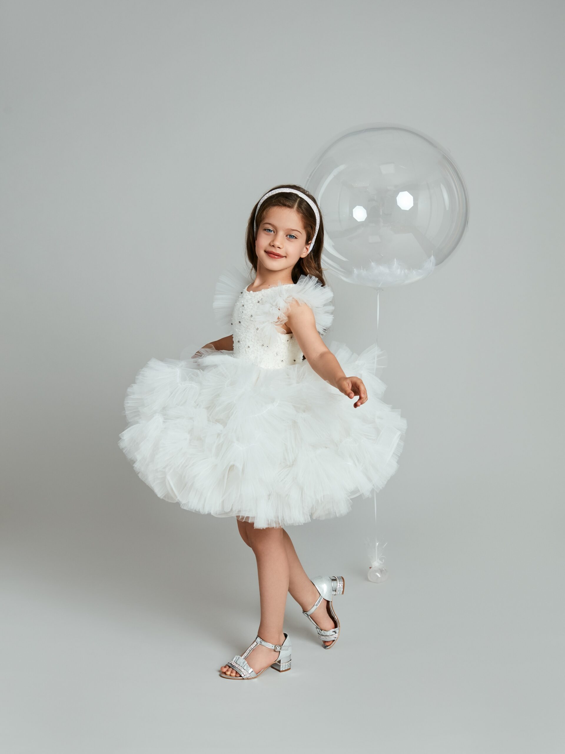 Let your little one shine like never before with the MIMI OPHELIA white tulle dress, a masterpiece of elegance and charm. This exquisite dress features a fully beaded bodice adorned with sparkling crystals and delicate pearls, creating a radiant, eye-catching look. The dramatic ruffled tulle sleeves add a playful touch, while the voluminous, multi-layered tulle skirt creates a fairy-tale silhouette perfect for twirling. Ideal for weddings, birthdays, and special celebrations, the MIMI OPHELIA dress offers both stunning style and all-day comfort, ensuring your child feels like a true princess at every event.