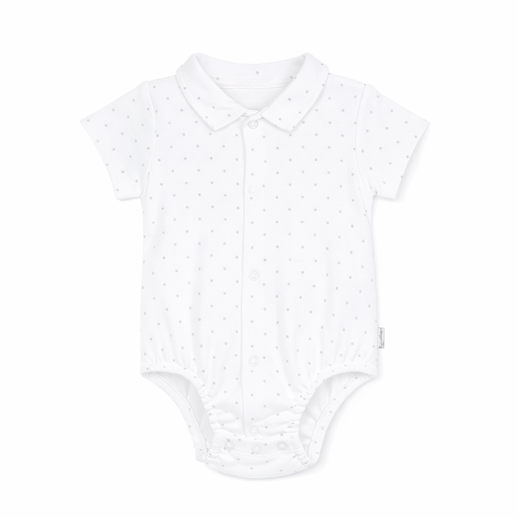 Wrap your little one in softness with our short-sleeved baby bodysuit, made from 100% certified organic cotton. This breathable and gentle fabric is perfect for sensitive newborn skin. Designed in a classic white with subtle grey polka dots, it features a charming collar and practical snap buttons for easy changing. Ideal for everyday wear or special occasions, this baby bodysuit is a must-have for your baby’s organic wardrobe.