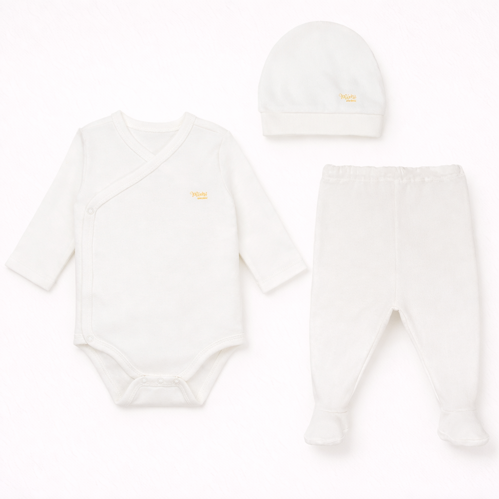 Wrap your newborn in softness with Mimi’s 4-piece organic cotton baby set. Thoughtfully designed for comfort and style, this set includes a footed pant, a soft wrap-style top, a long-sleeve bodysuit, and a matching hat — all made from 100% GOTS-certified organic cotton. Gentle on sensitive skin, breathable, and incredibly cozy, it’s the perfect first outfit for your little one.