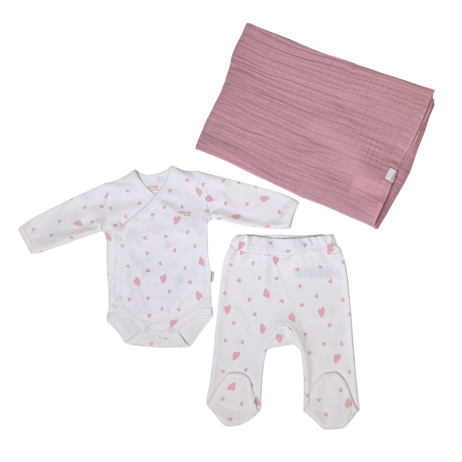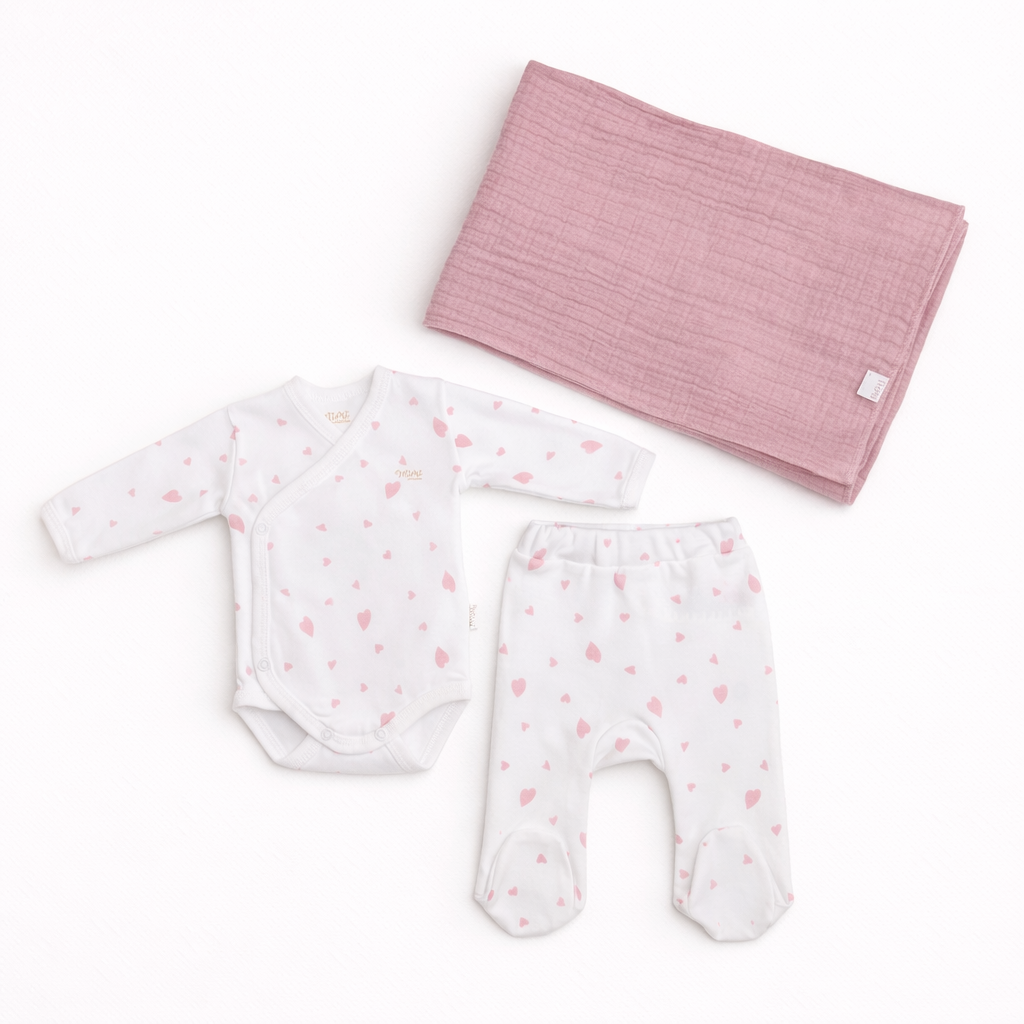 Wrap your little love in softness with our Sweetheart Newborn Set, crafted from 100% certified organic cotton. This adorable 3-piece set includes a long-sleeve wrap bodysuit, cozy footed pants, and a light pink muslin blanket. Featuring delicate heart prints, it’s perfect for newborn girls — gentle on the skin, breathable, and ideal as a baby shower or hospital gift.